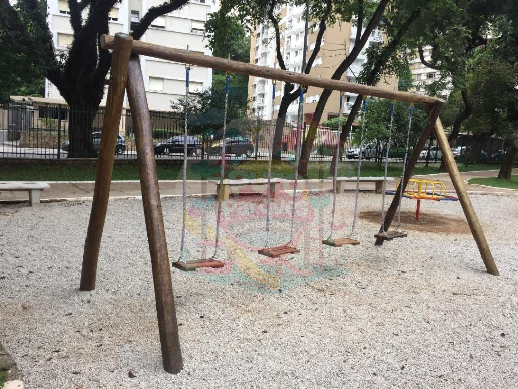 Balanço quádruplo em tronco de eucalipto tratado em autoclave ou em aço com pintura eletrostática, com correntes galvanizadas e encapadas para maior segurança e durabilidade. Equipado com quatro assentos de madeira, oferecendo conforto e resistência em ambientes externos.