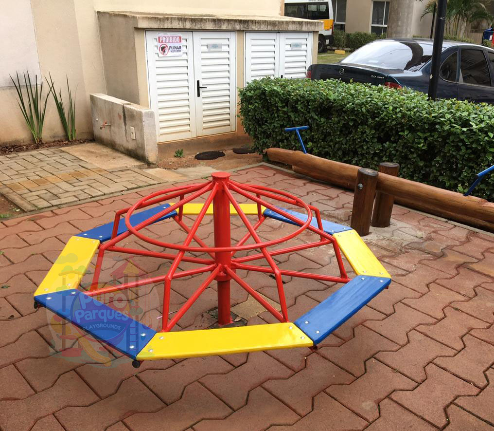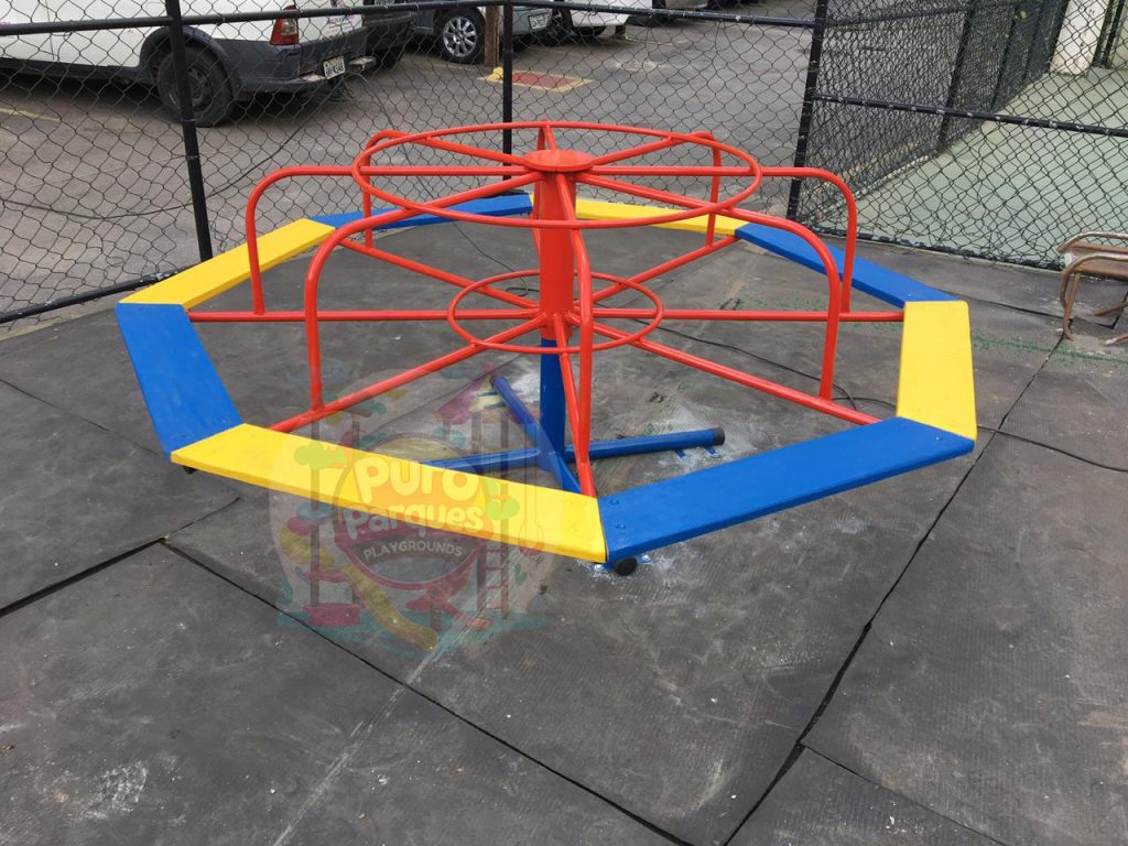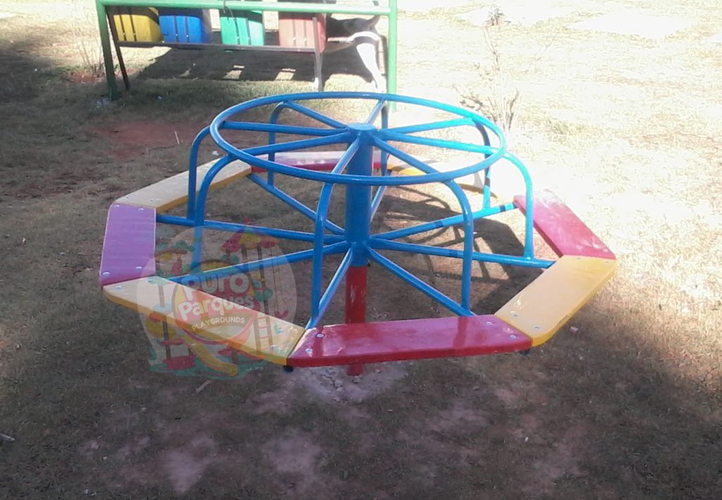 Gira-gira em tubos de aço carbono, com 8 assentos duplos de madeira coloridos, permitindo até 16 crianças para o uso. Estrutura resistente, ideal para áreas externas.