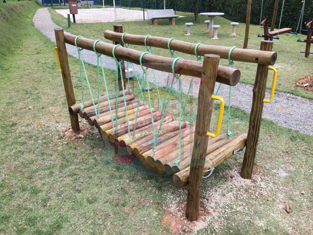 Ponte suspensa em tronco de eucalipto tratado em autoclave, com estrutura resistente e segura, ideal para atividades de equilíbrio e coordenação motora em ambientes externos.