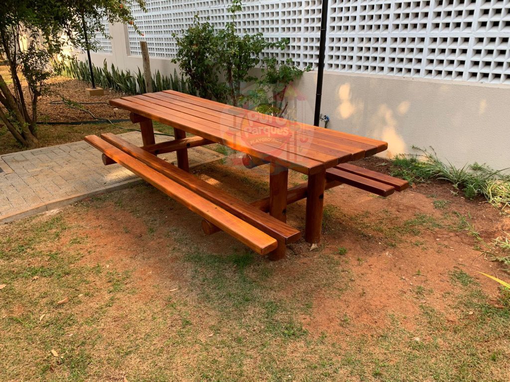 Mesa em eucalipto tratada em autoclave, com estrutura sólida e acabamento natural. Ideal para áreas externas ou ambientes rústicos, oferecendo funcionalidade, resistência e um toque acolhedor ao espaço.