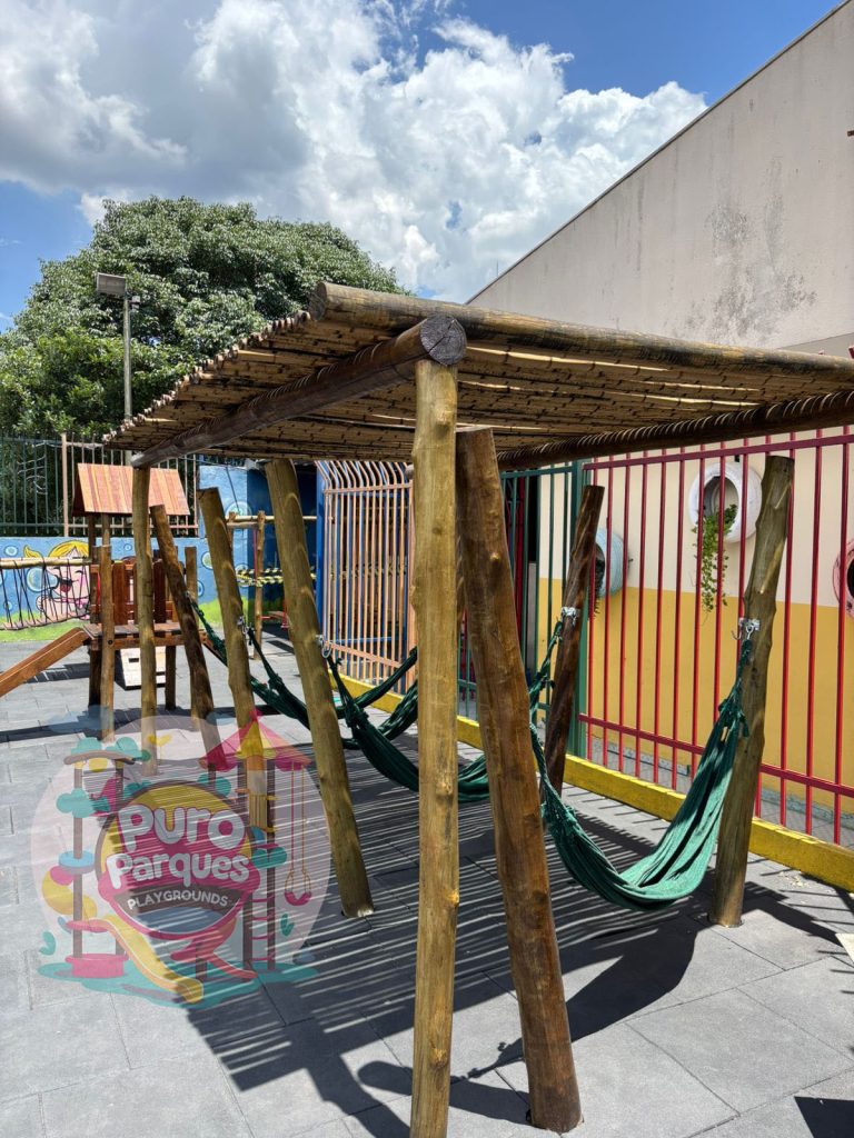 Redário em tronco de eucalipto tratado em autoclave, com estrutura resistente e acabamento natural, ideal para áreas externas como jardins, varandas e espaços de descanso.