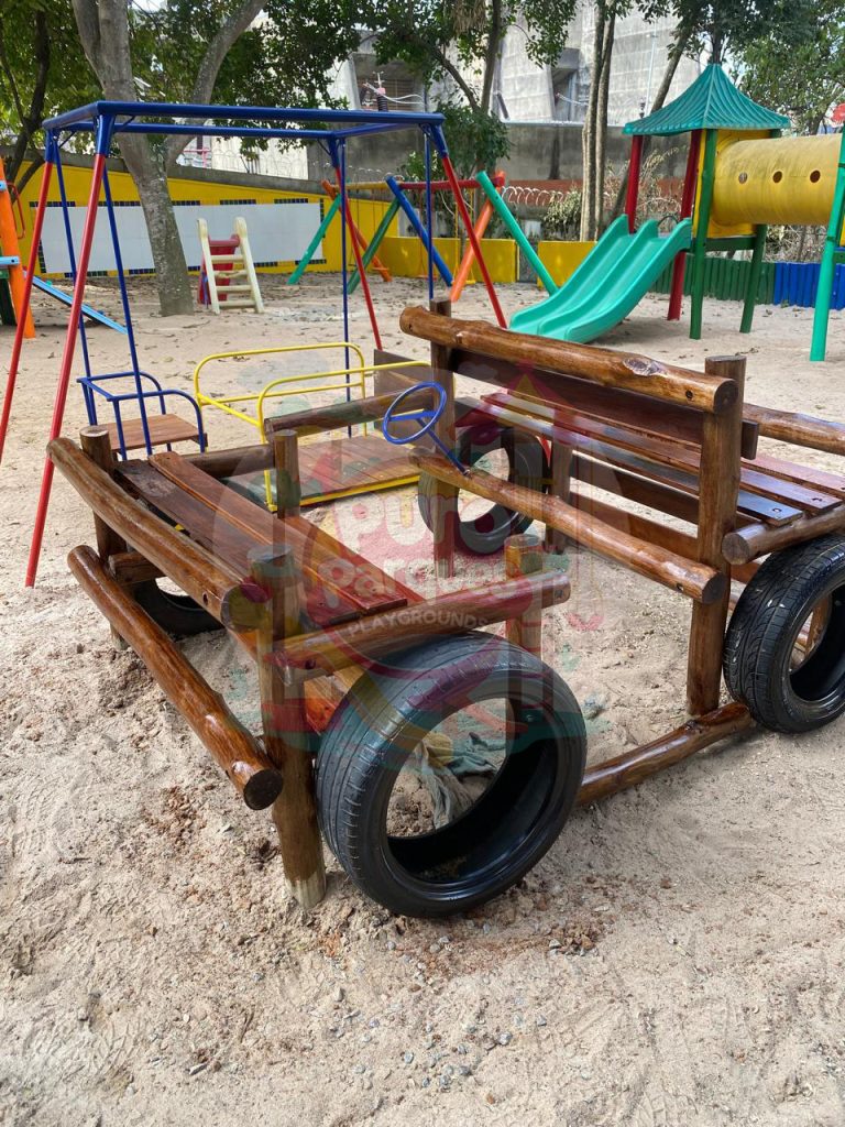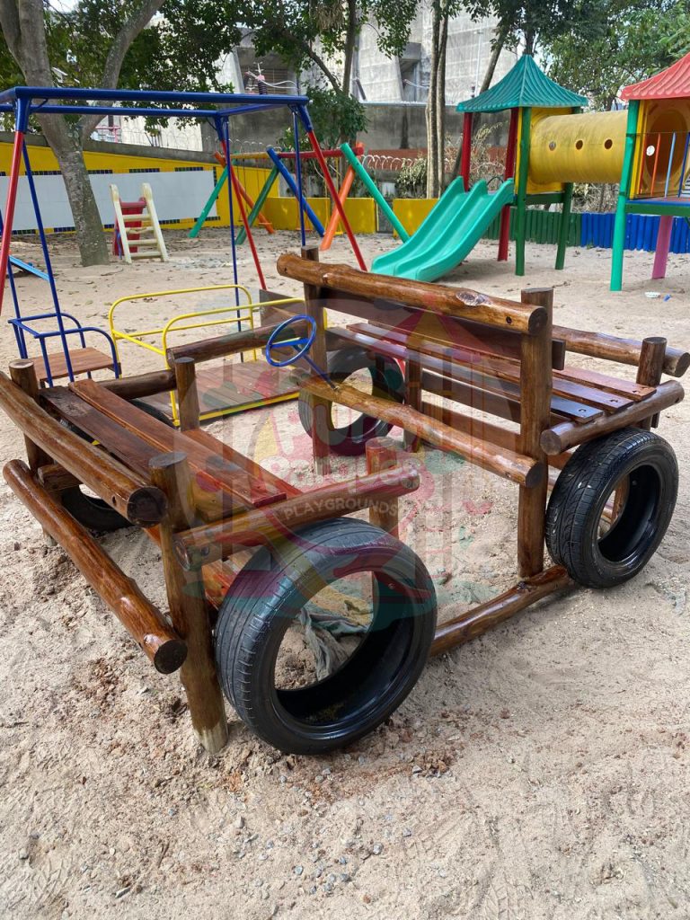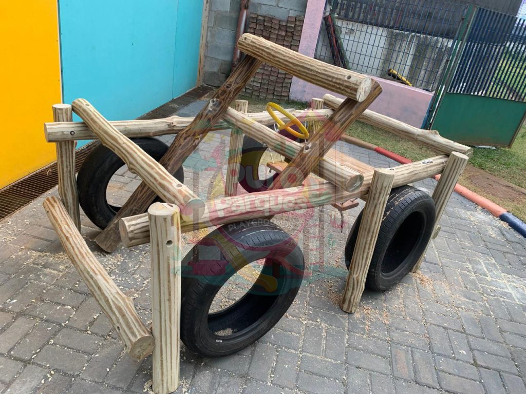 Figura decorativa em formato de jipe, esculpida em tronco de eucalipto tratado em autoclave. Peça rústica e resistente, ideal para composições em áreas externas como parquinhos, jardins e espaços temáticos.