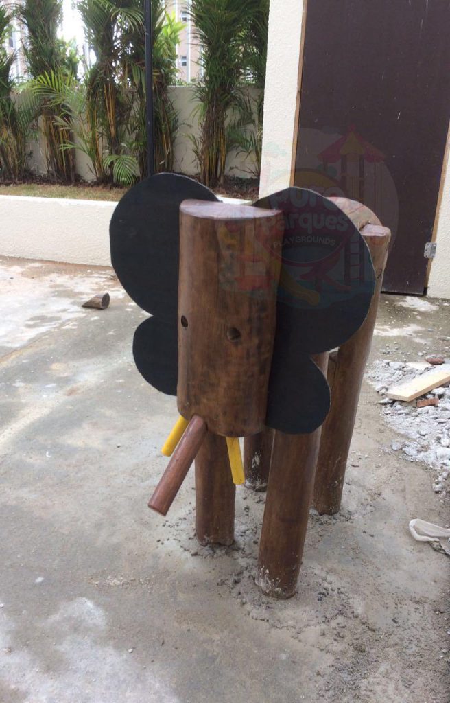Figura decorativa em formato de elefante, esculpida em tronco de eucalipto tratado em autoclave. Peça rústica e resistente, ideal para composições em áreas externas como parquinhos, jardins e espaços temáticos.
