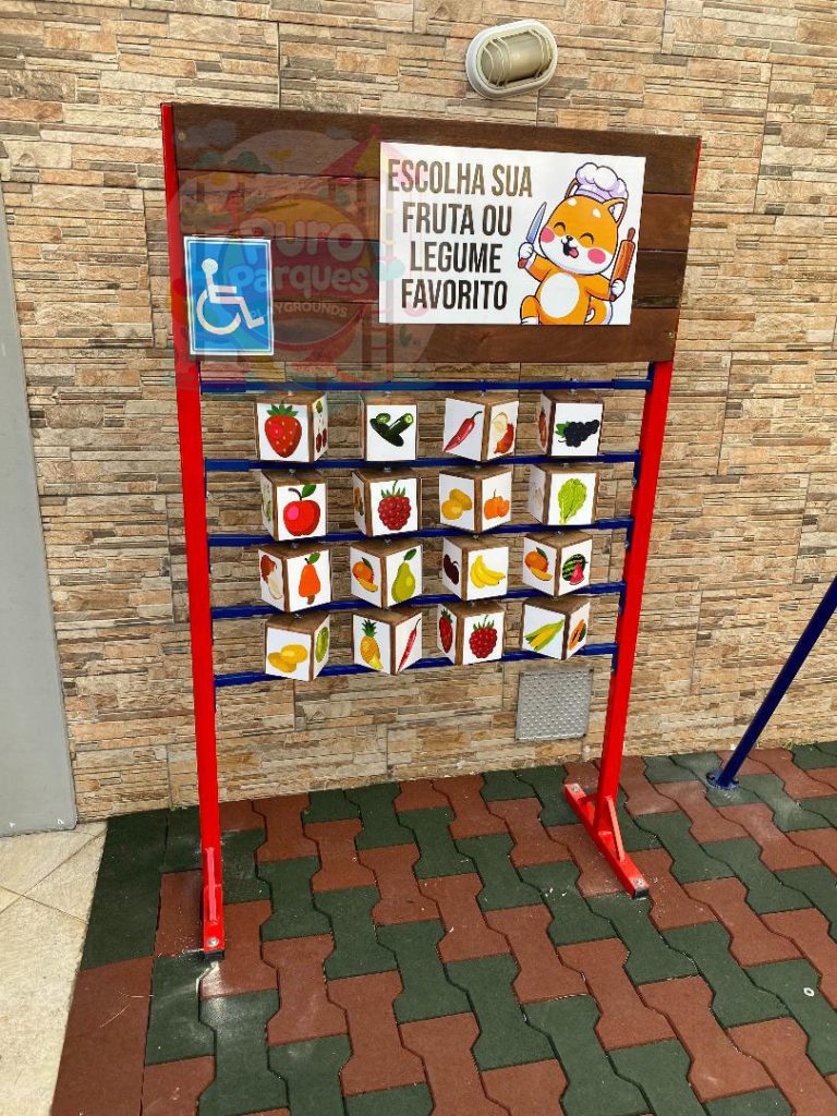Pictograma com placas acrílicas, estrutura em aço com pintura eletrostática e blocos giratórios de madeira colorida. Ideal para áreas externas, promove interação e desenvolvimento cognitivo de forma lúdica.